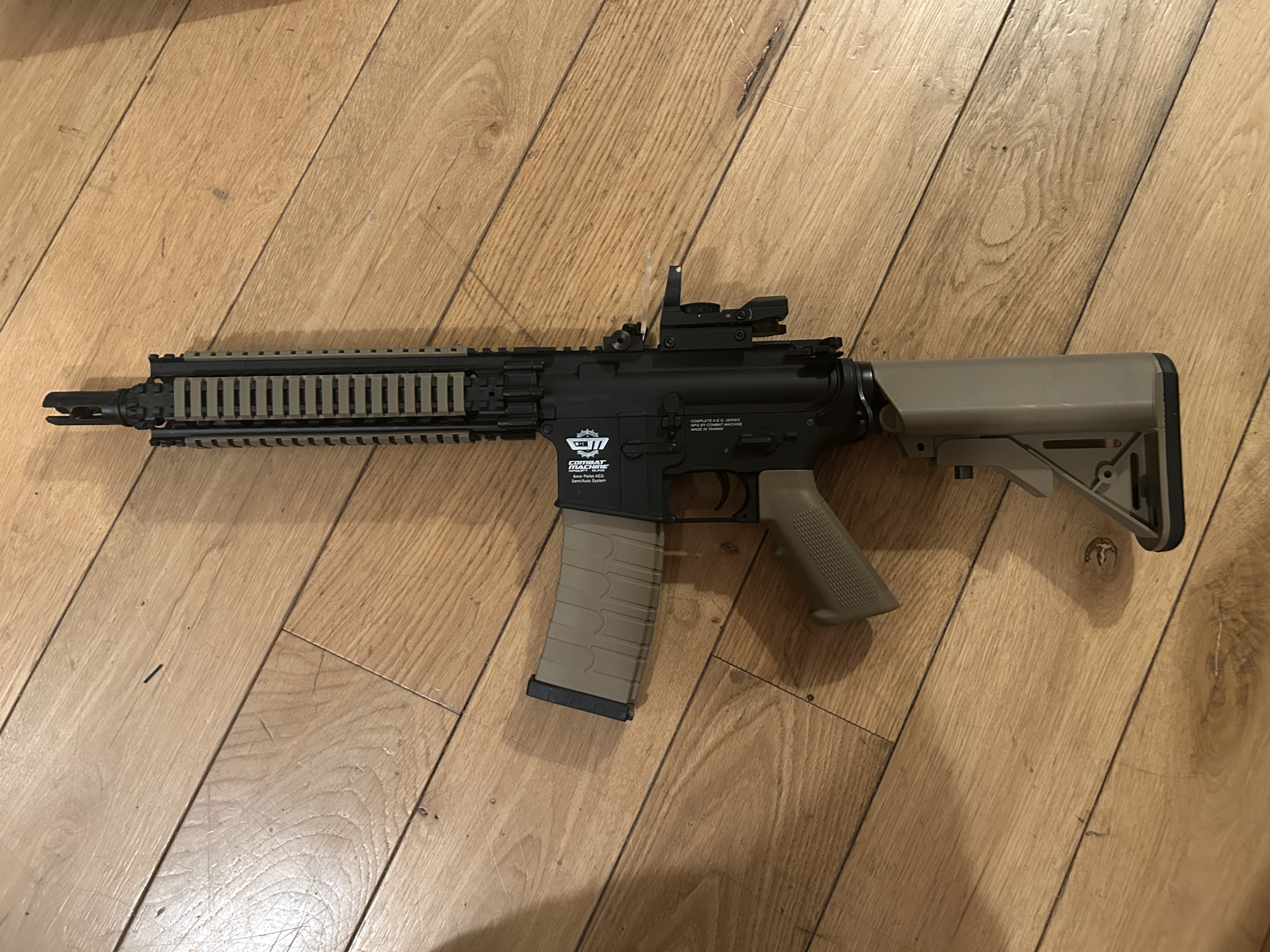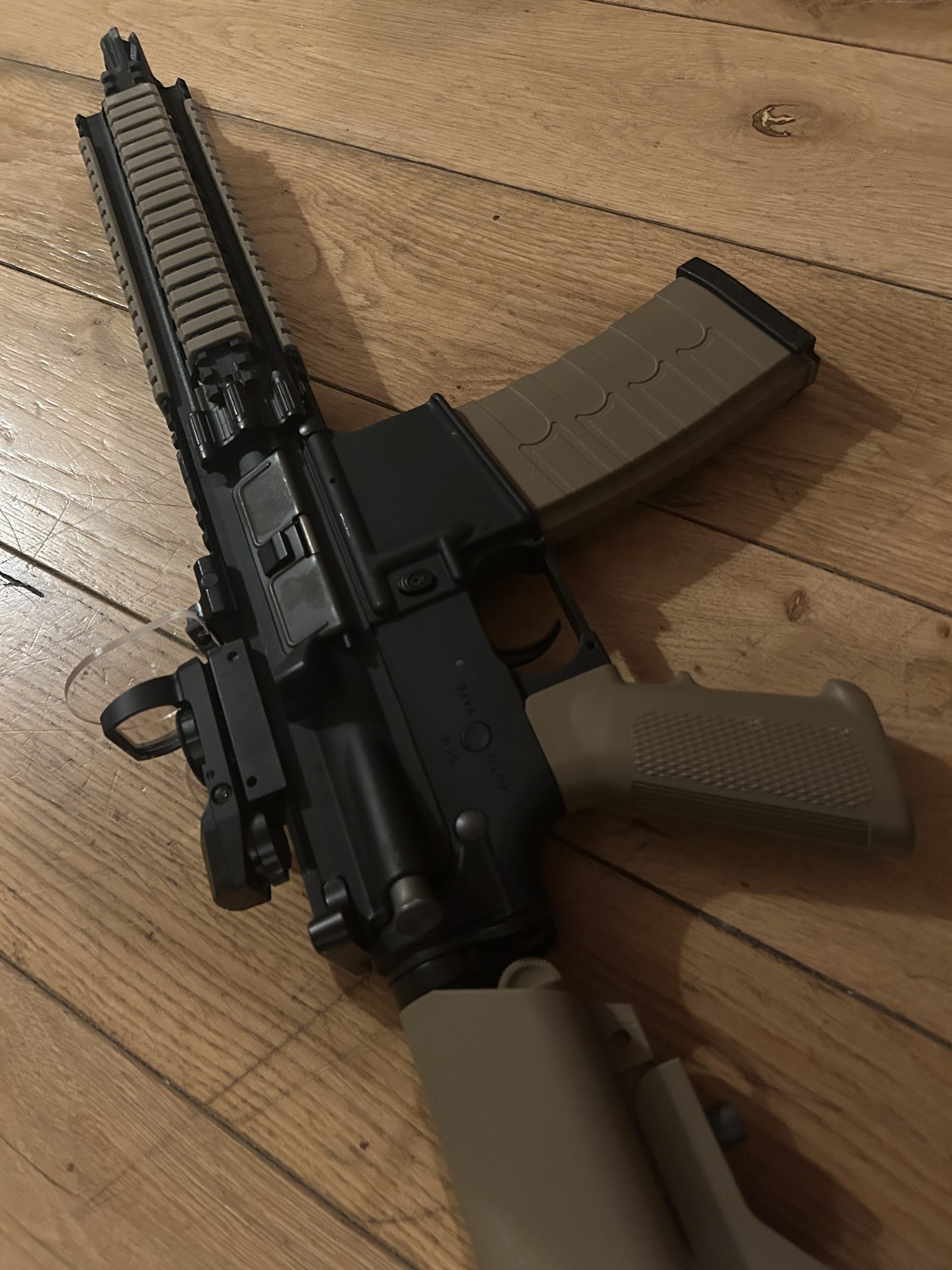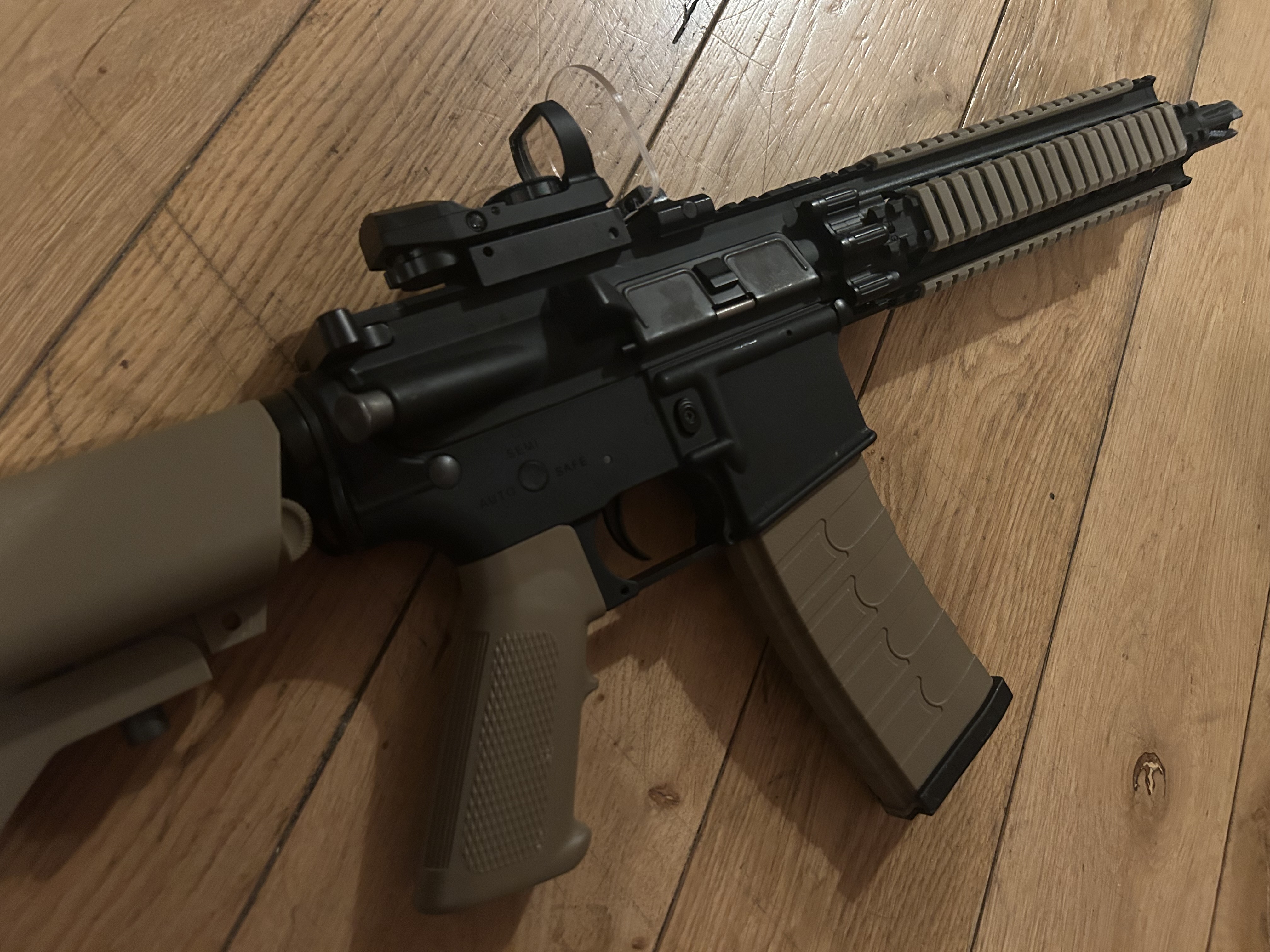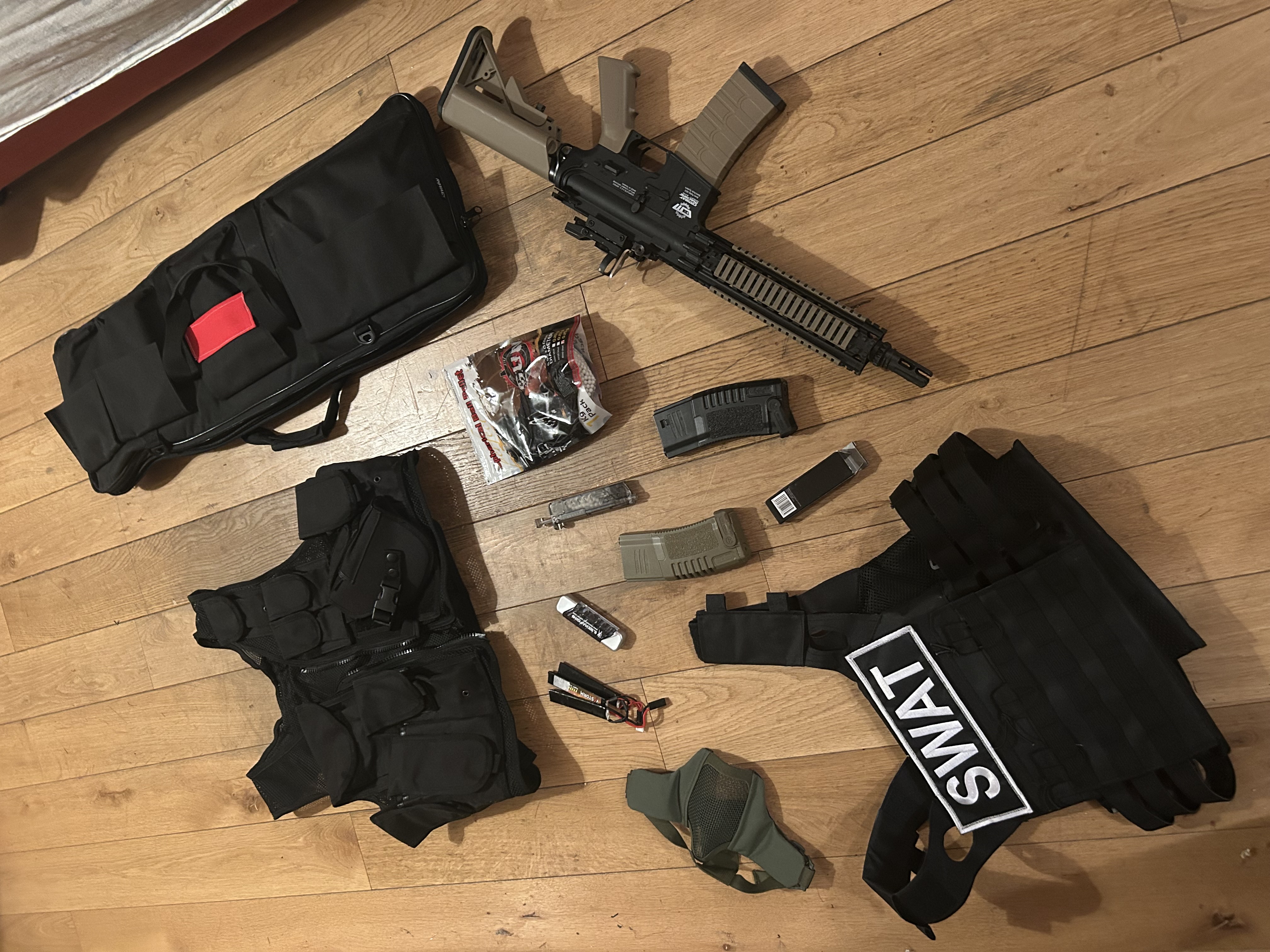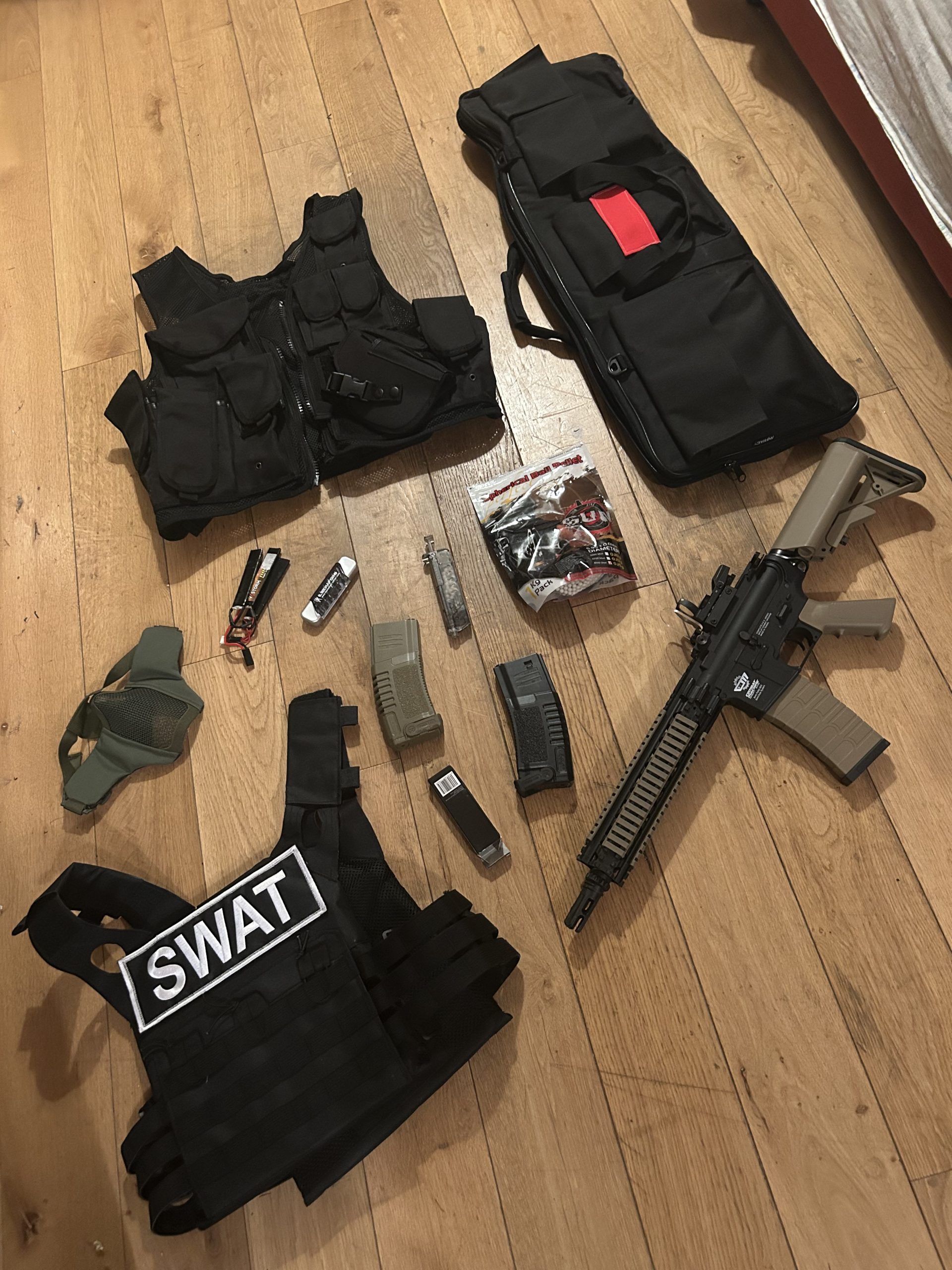 Fucile M4A1, caricatori, giubbotto antiproiettile, sacca per fucile multi tasca, e accessori vari