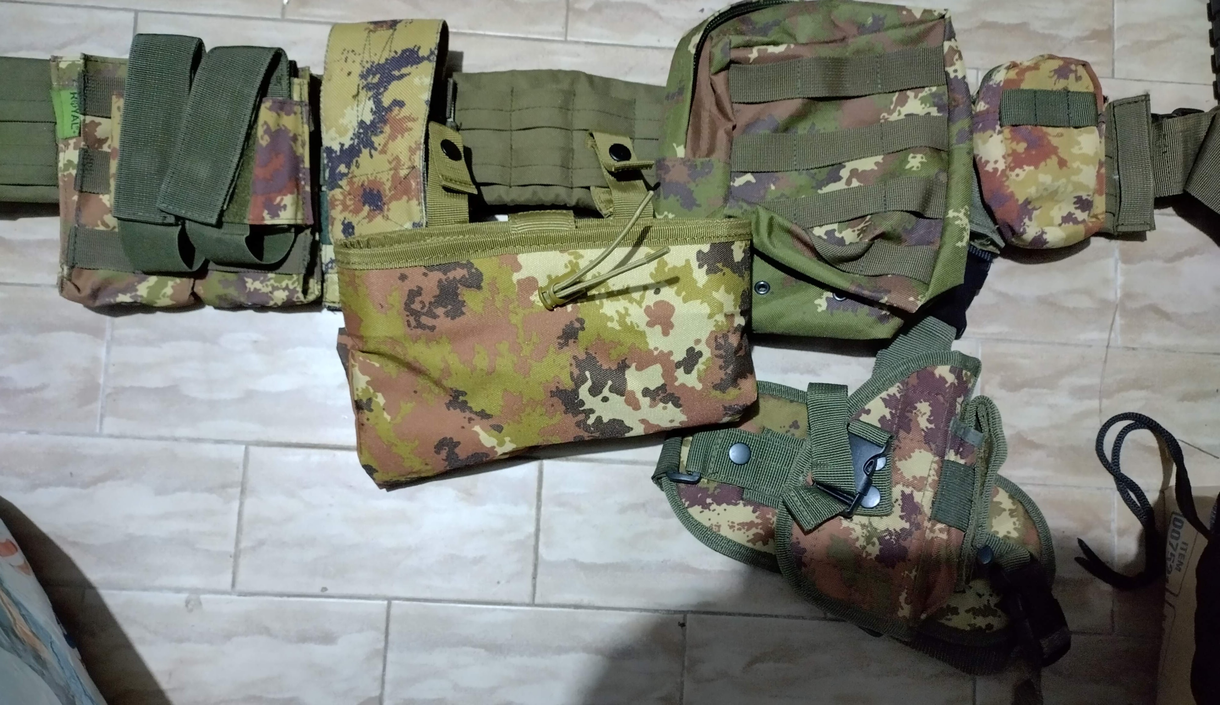 Cinturone tattico completo per softair composto da cinturone semirigido con attacchi molle, portacaricatore tipo M4 doppio, portacaricatore tipo pistola doppio, tasca per doppio caricatore o portapallini, sacca caricatori vuoti, tasca utility media, fondina cosciale universale regolabile con portacaricatore, tasca utility piccola. Tutto con mimetismo vegetato.