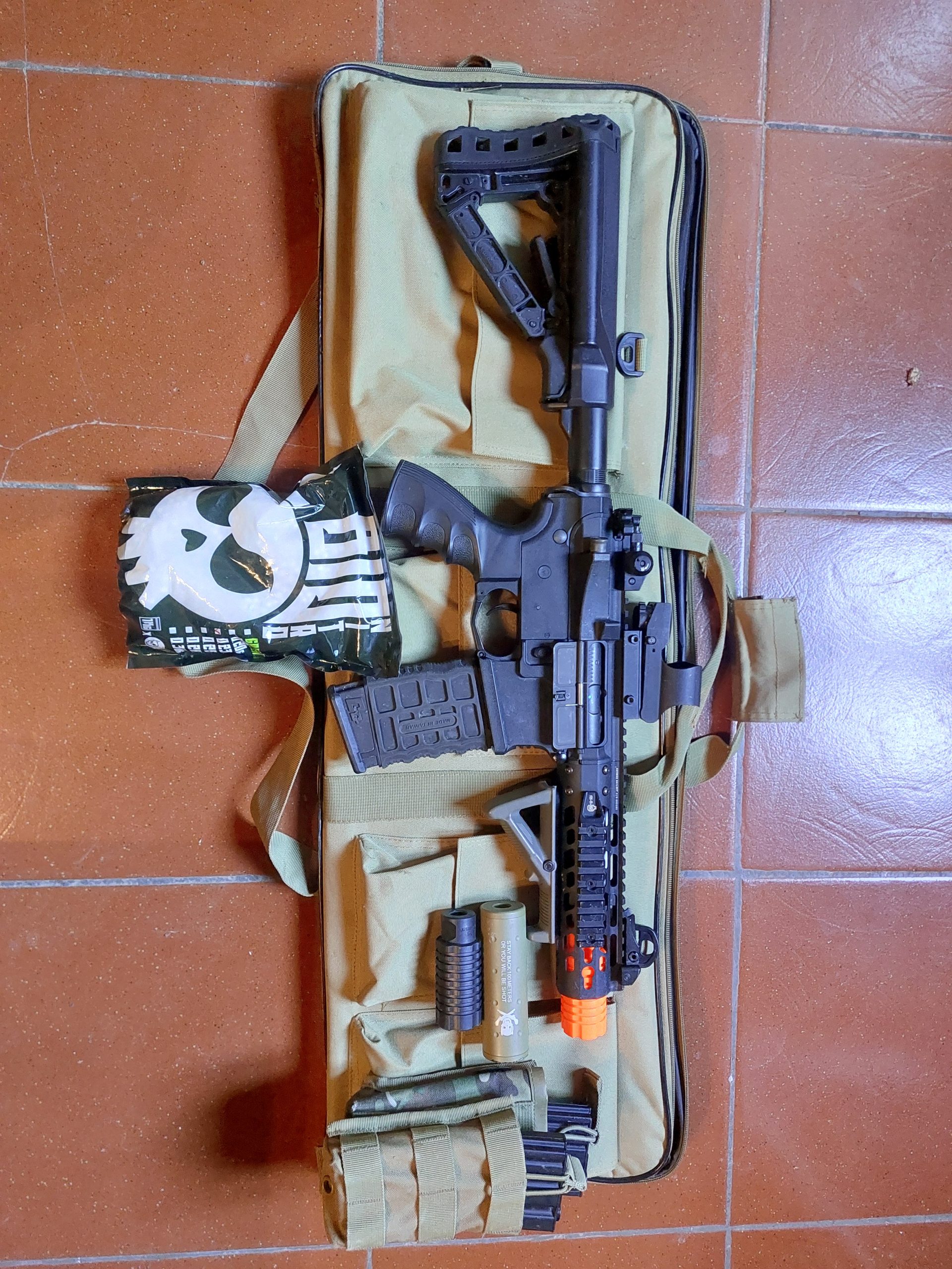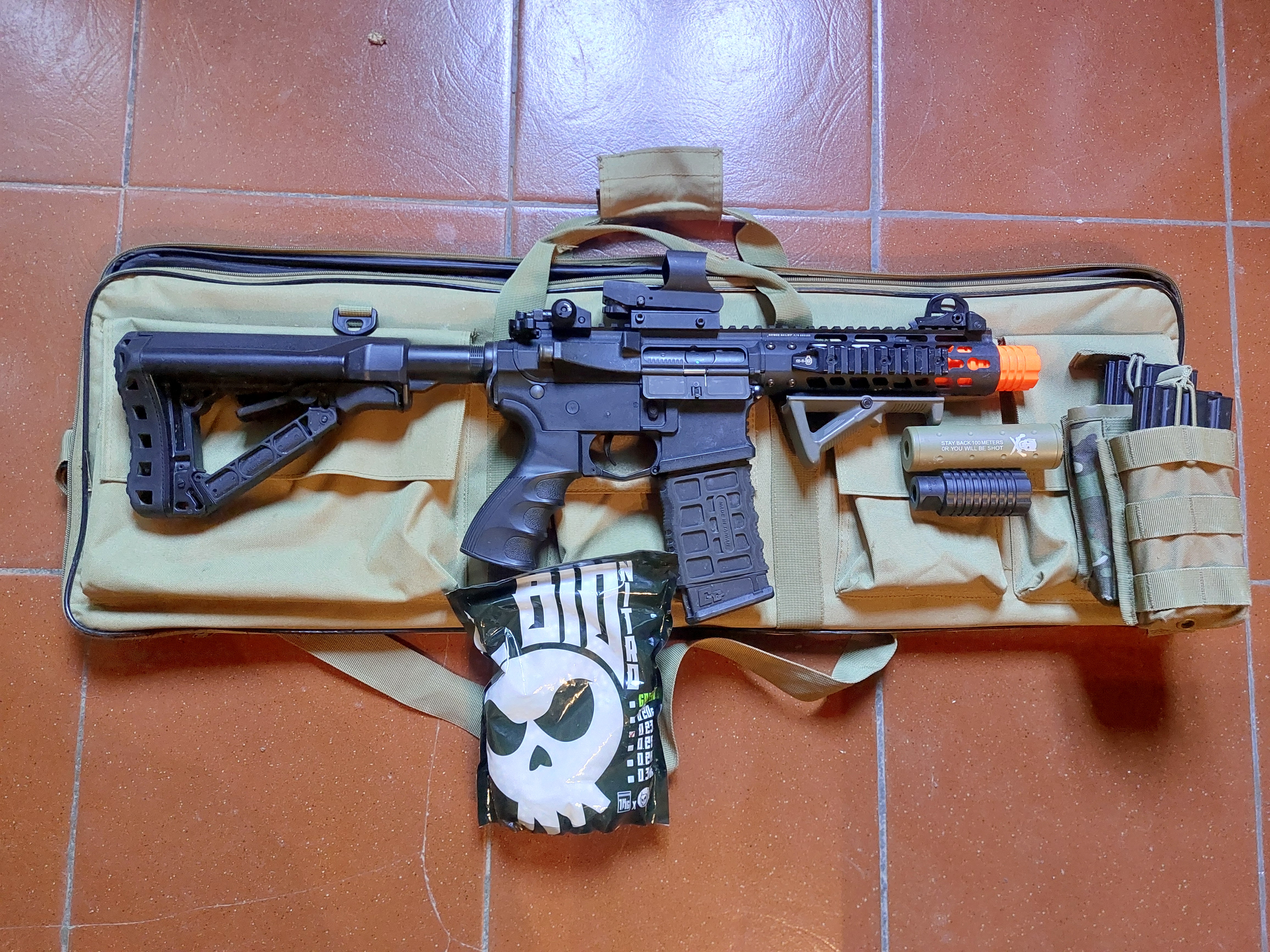 Al 100% funzionante, il fucile monta qualche accessorio tra cui: impugnatura angolare – mirino olografico funzionante- silenziatore – 2 caricatori di scorta + quello originale.